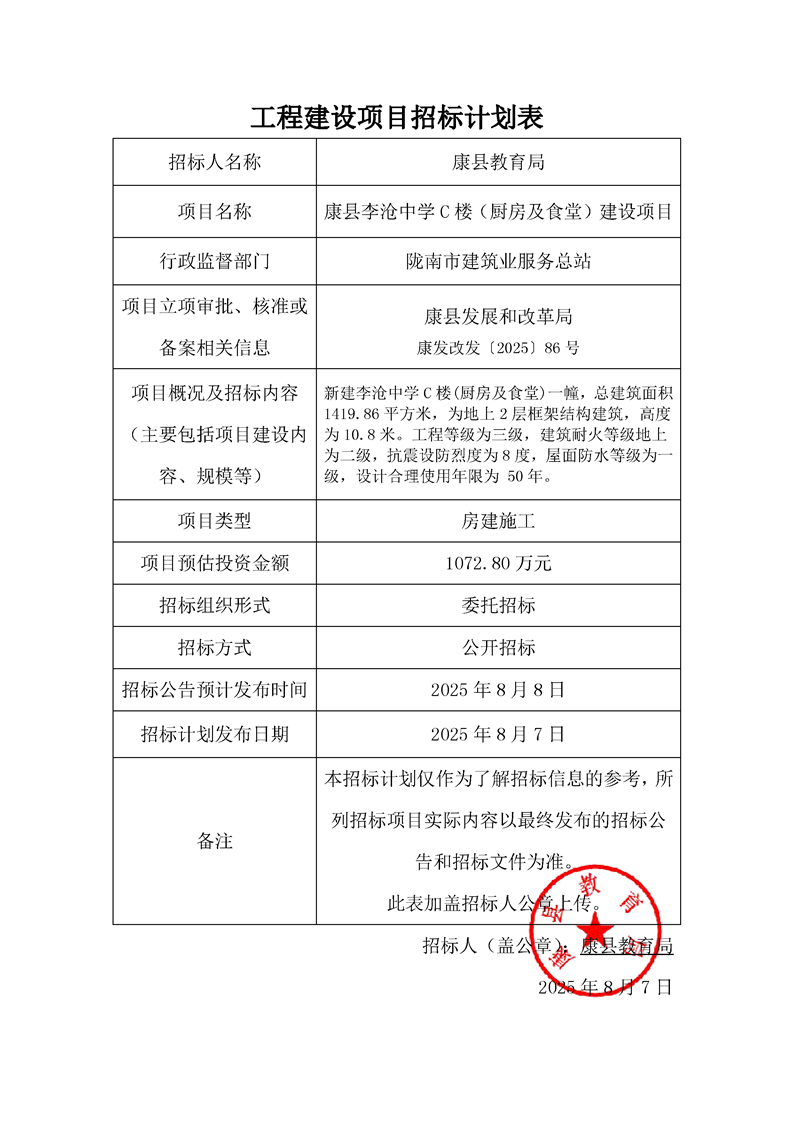 康縣李滄中學(xué)C樓(廚房及食堂)建設(shè)項(xiàng)目