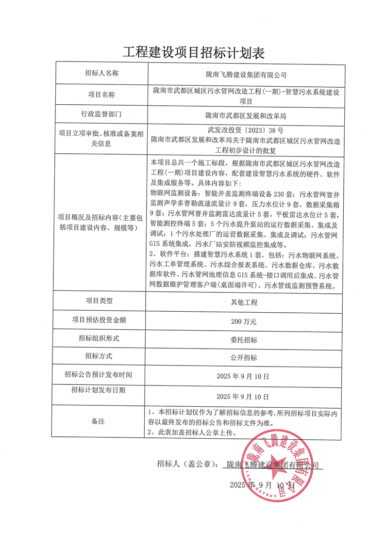 隴南市武都區(qū)城區(qū)污水管網(wǎng)改造工程(一期)-智慧污水系統(tǒng)建設(shè)項目