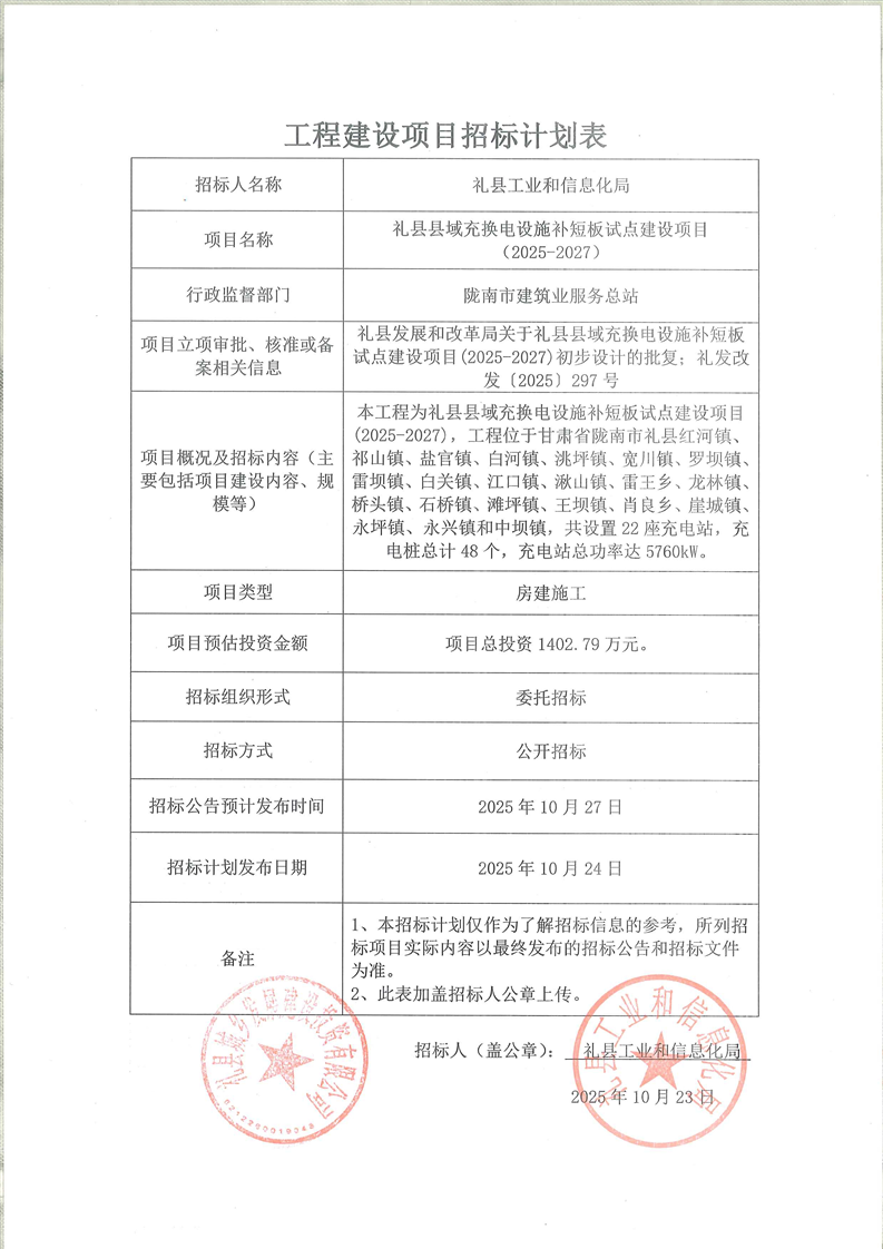 禮縣縣域充換電設(shè)施補(bǔ)短板試點(diǎn)建設(shè)項(xiàng)目(2025-2027)