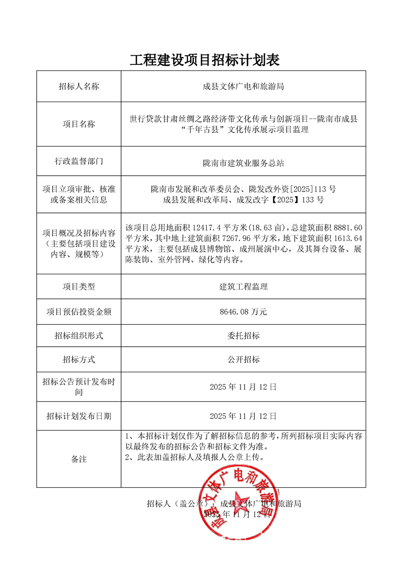 附件:工程建設(shè)項(xiàng)目招標(biāo)計(jì)劃表世行貸款甘肅絲綢之路經(jīng)濟(jì)帶文化傳承與創(chuàng)新項(xiàng)目--隴南市成縣“千年古縣”文化傳承展示項(xiàng)目監(jiān)理.pdf