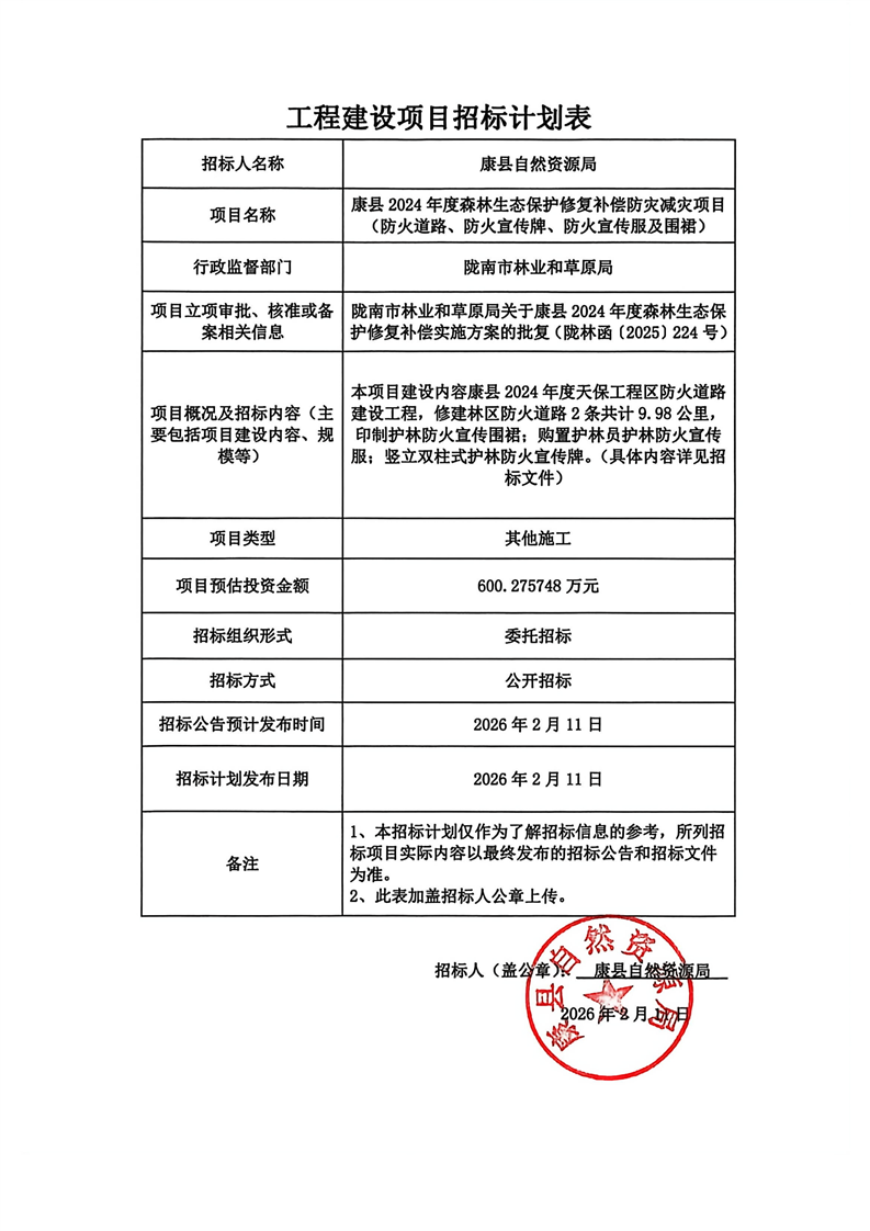 康縣2024年度森林生態(tài)保護修復(fù)補償防災(zāi)減災(zāi)項目(防火道路、防火宣傳牌、防火宣傳服及圍裙)