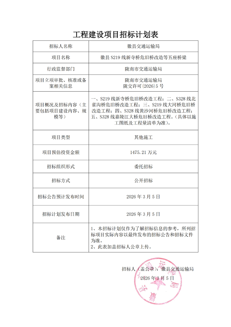徽縣S219線新寺橋危舊橋改造等五座橋梁
